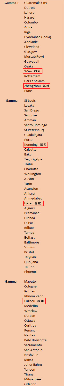 此次排名中伦敦和纽约的地位,不可撼动。今年全球一线城市的变化在于,香港前进一名入围前三,北京首次进入“四强”,而广泛性全球化代表城市新加坡,则从第3下滑至第5。此外,深圳从Beta升至Alpha-,首次进入世界一线城市行列。 中国城市榜上名次 中国Beta-级(二线弱)以上城市 Alpha++(特等):无 Alpha+(一线强):香港、北京、上海 Alpha(一线中):台北、广州 Alpha-(一线弱):深圳 Beta+(二线强):成都、杭州 Beta(二线中):天津、南京、武汉 Beta-(二线弱):重庆、苏州、大连、厦门、长沙、沈阳、青岛、济南 其余上榜城市 Gamma+(三线强):西安、郑州 Gamma(三线中):昆明、合肥 Gamma-(三线弱):福州 High Sufficiency(高度自足城市):宁波 Sufficiency(自足城市):哈尔滨、长春、南昌、台中、兰州、贵阳、海口、无锡、珠海、南宁、西宁、南通等。 在本次发布的排名中,我国共有11个城市进入世界城市前100名,按照排名先后顺序分别是:香港,北京,上海,台北,广州,深圳,成都,杭州,天津,南京,武汉。